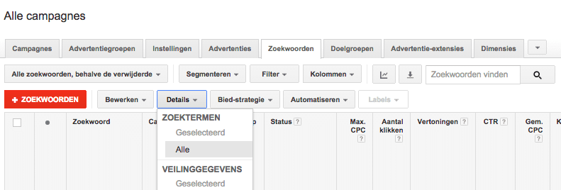 Van belang hierbij is dat je wekelijks in de gaten houdt op wat voor zoekwoordcombinaties jouw advertentie wordt geactiveerd. Je kunt dit doen door naar het tabblad Zoekwoorden te gaan en vanuit daar te klikken op het tabblad Details > Zoektermen > Alle.