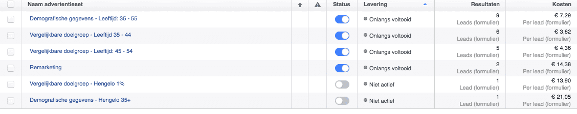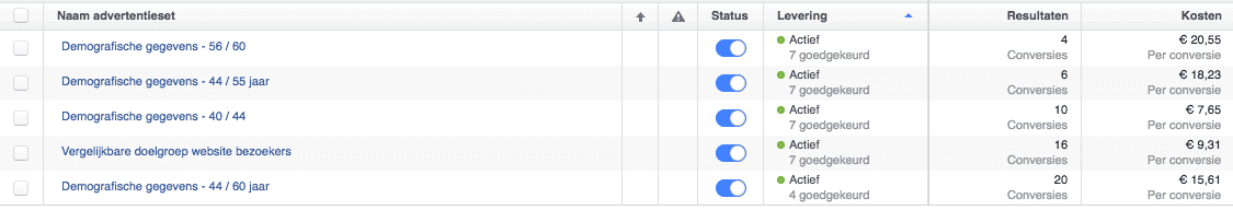 Zelf test ik verschillende doelgroepen en de statistieken hierboven liegen er niet om. Je ziet al direct waar de rotte appel en waar de koning der conversies zitten. Had ik geen verschillende doelgroepen opgezet, dan zou ik vele euro’s meer moeten investeren dan dat ik op dit moment doe voor het genereren van nieuwe opdrachten.