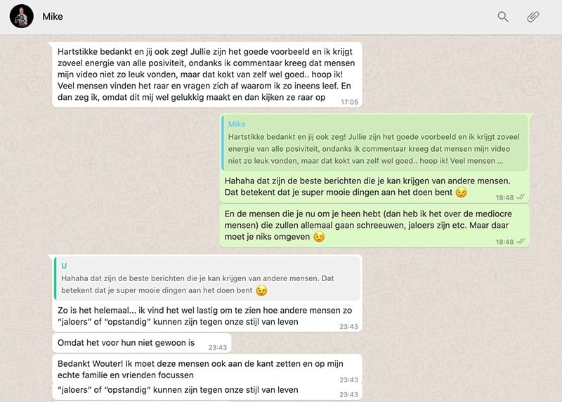 Mike geeft in het bericht naar mij aan hoe mensen negatief reageren op zijn video’s over zijn persoonlijke ontwikkeling en ze vinden het raar dat hij opeens op zo’n andere manier is gaan leven. En als hij dan aangeeft dat dit hem gelukkig maakt, dan kijken zij hem vreemd aan.