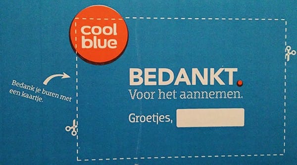 Je kent het wel, je pakketje wordt geleverd maar je bent niet thuis. Gelukkig wordt het pakketje afgeleverd bij je buurman waar je het met een opgelucht hart kunt ophalen. Coolblue geeft je hierbij de “stille hint” om je buurman nog even te bedanken. Als we het hebben over mond-tot-mond reclame! Jij en je buurman hebben een goed gevoel door het bedankje en Coolblue krijgt er misschien wel een nieuwe klant bij door. In ieder geval is hun naamsbekendheid vergroot.